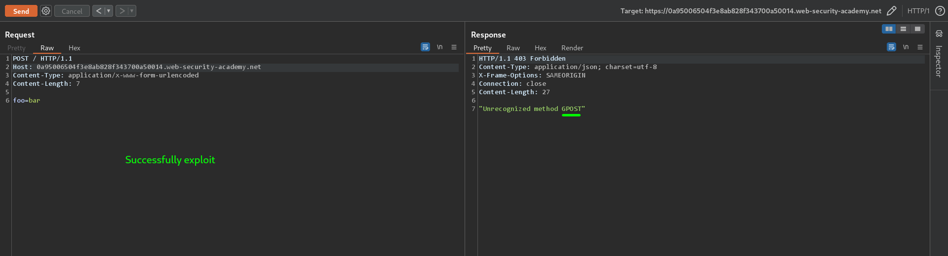 1. Change the request attributes HTTP/2 to HTTP/1 and the method GET to POST. Add the content length and payload as mentioned below. Make sure "***Update Content-length***" is disabled.